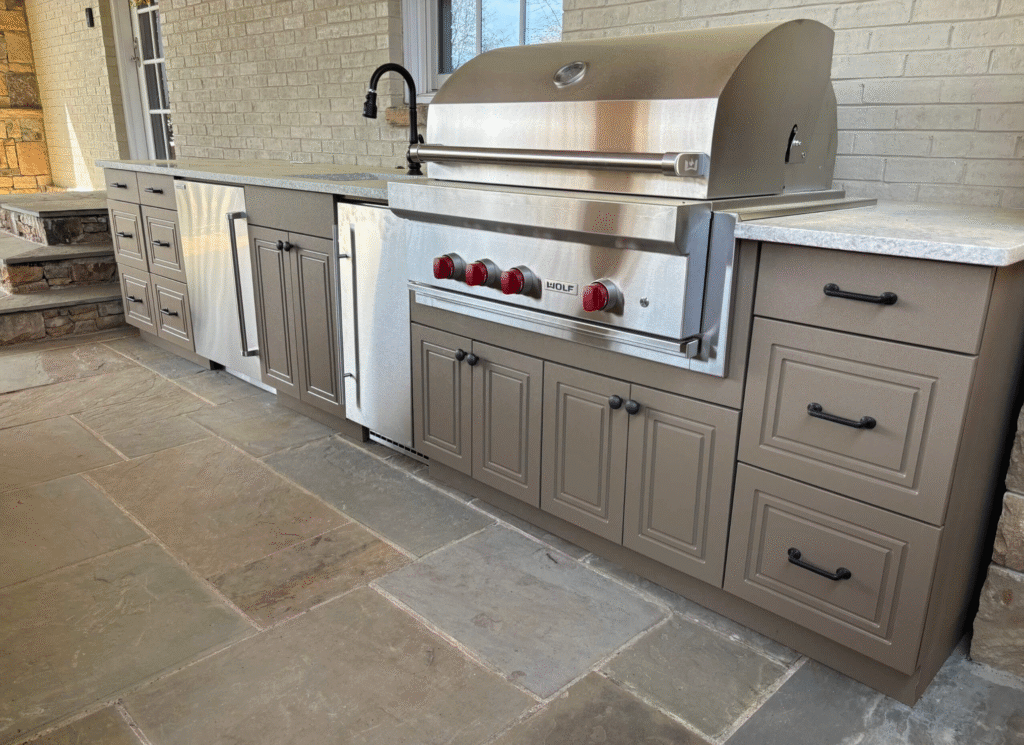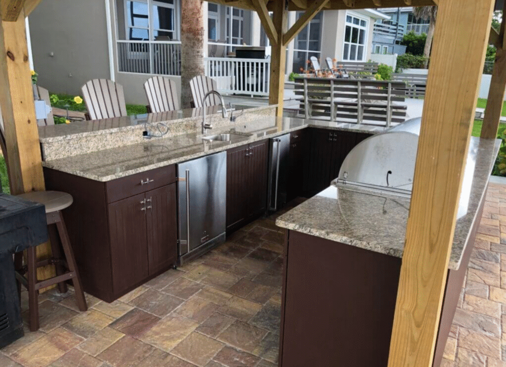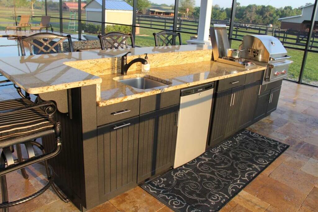 Dark cabinetry hides everyday wear and mess (a big win for families and frequent hosts), and it instantly gives an outdoor kitchen that tailored, architectural feel.