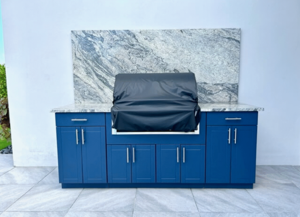 Coastal isn’t just navy-and-white anymore. In 2026, the coastal trend shifts toward saturated blues and “vacation tones” that feel intentional, not themed. A deep blue island or blue base cabinets can anchor an entire patio design.