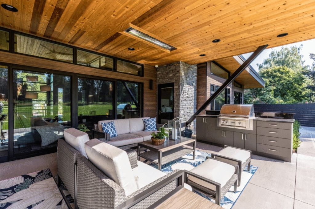 This scheme makes patios feel larger, cleaner, and resort-like. And with today’s outdoor fabrics and performance materials, the “too risky” fear is less of a deal-breaker.