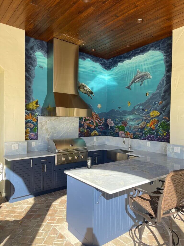 The completed kitchen is a dramatic upgrade. Rich Sapphire cabinets ground the design with deep color, while bright countertops and a striking underwater mural bring energy and movement to the space. What was once ordinary now feels like a true escape, playful, luxurious, and built for gathering.