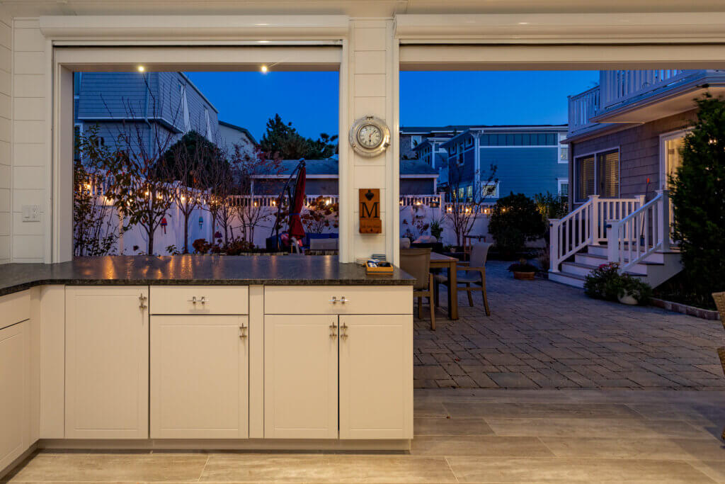 At dusk, the large bi-fold door panels slide away to reveal a fully equipped kitchen nestled under a sleek, covered pavilion. The highlight is a generous wrap-around countertop