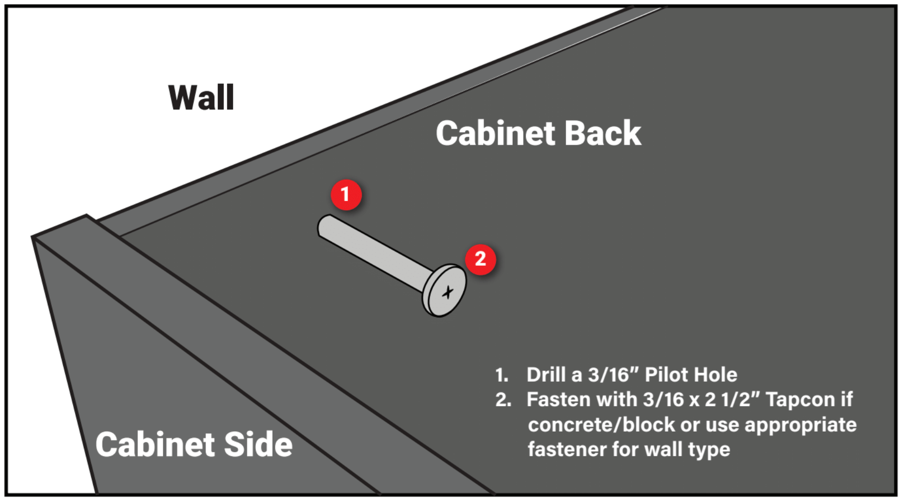 Once leveled, fasten cabinets to walls using common hardware (not provided). For concrete block or stucco walls, stainless steel Tapcon® fasteners are recommended. Two fasteners per cabinet are recommended for base cabinets, and minimum four fasteners are recommended for wall cabinets.