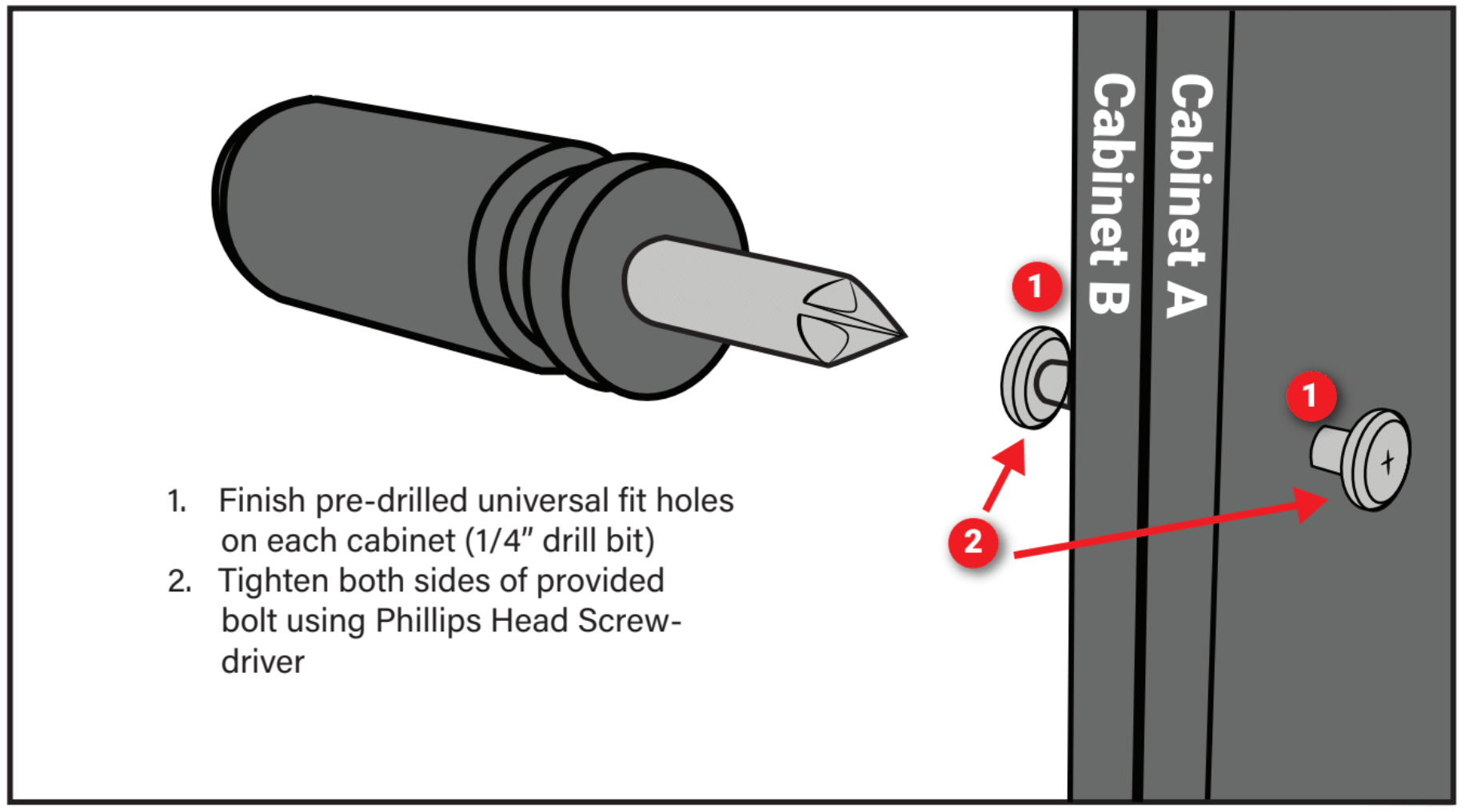 Most cabinets and fillers have partially pre-drilled “universal fit” holes that are perfectly aligned for a precision fit. Finish drilling the holes of two adjoining cabinets using a ¼” drill bit, and then fasten the cabinets together using the provided hardware.