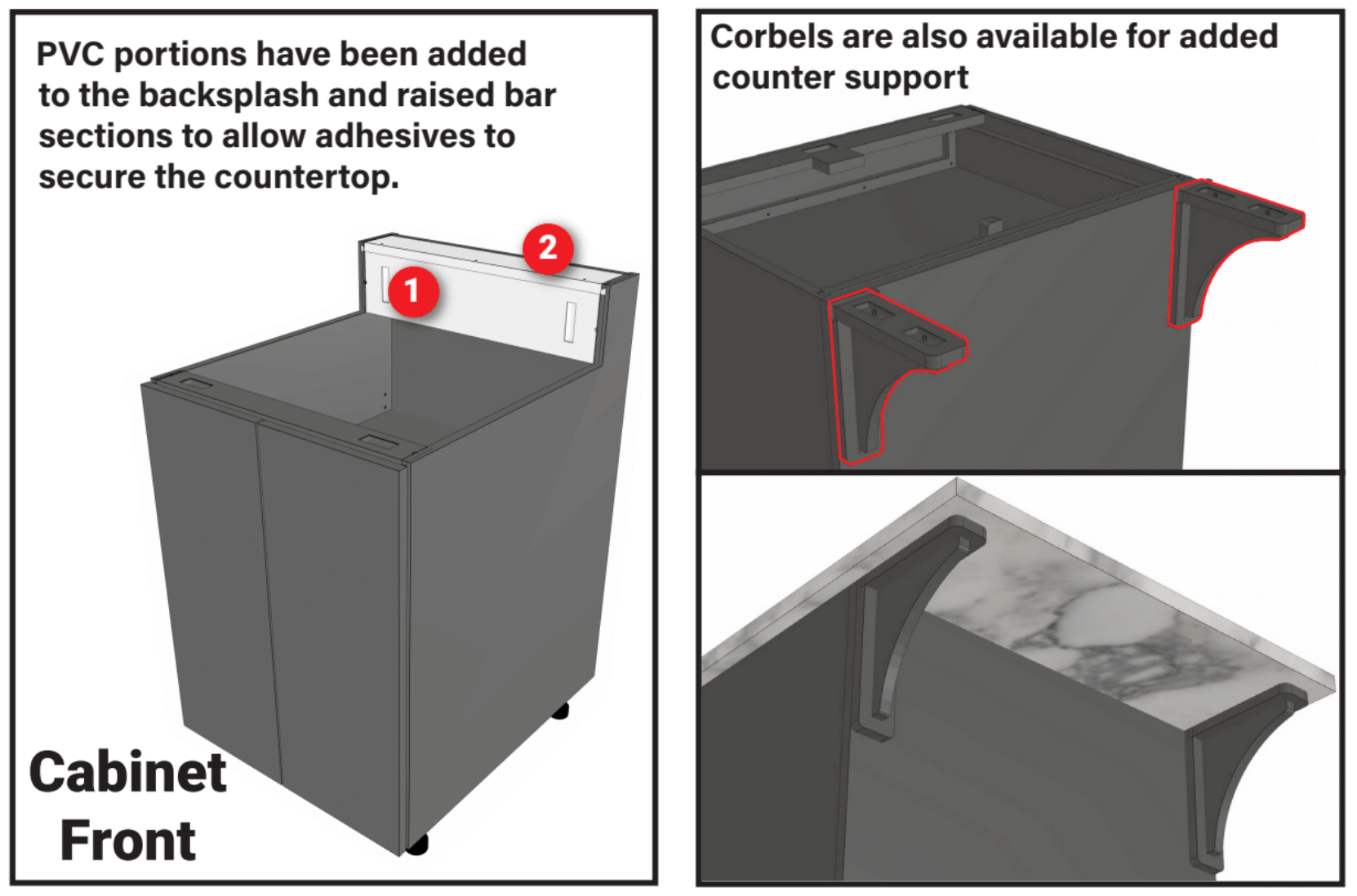 Nearly all countertop types can be installed with our cabinets. Professional countertop fabrication is recommended for granite, concrete, quartz (Silestone® or Zodiaq®), or solid-surface acrylic (Corian®) materials. Countertop adhesive will create a “cleat” inside our spreader glue blocks (shown below).