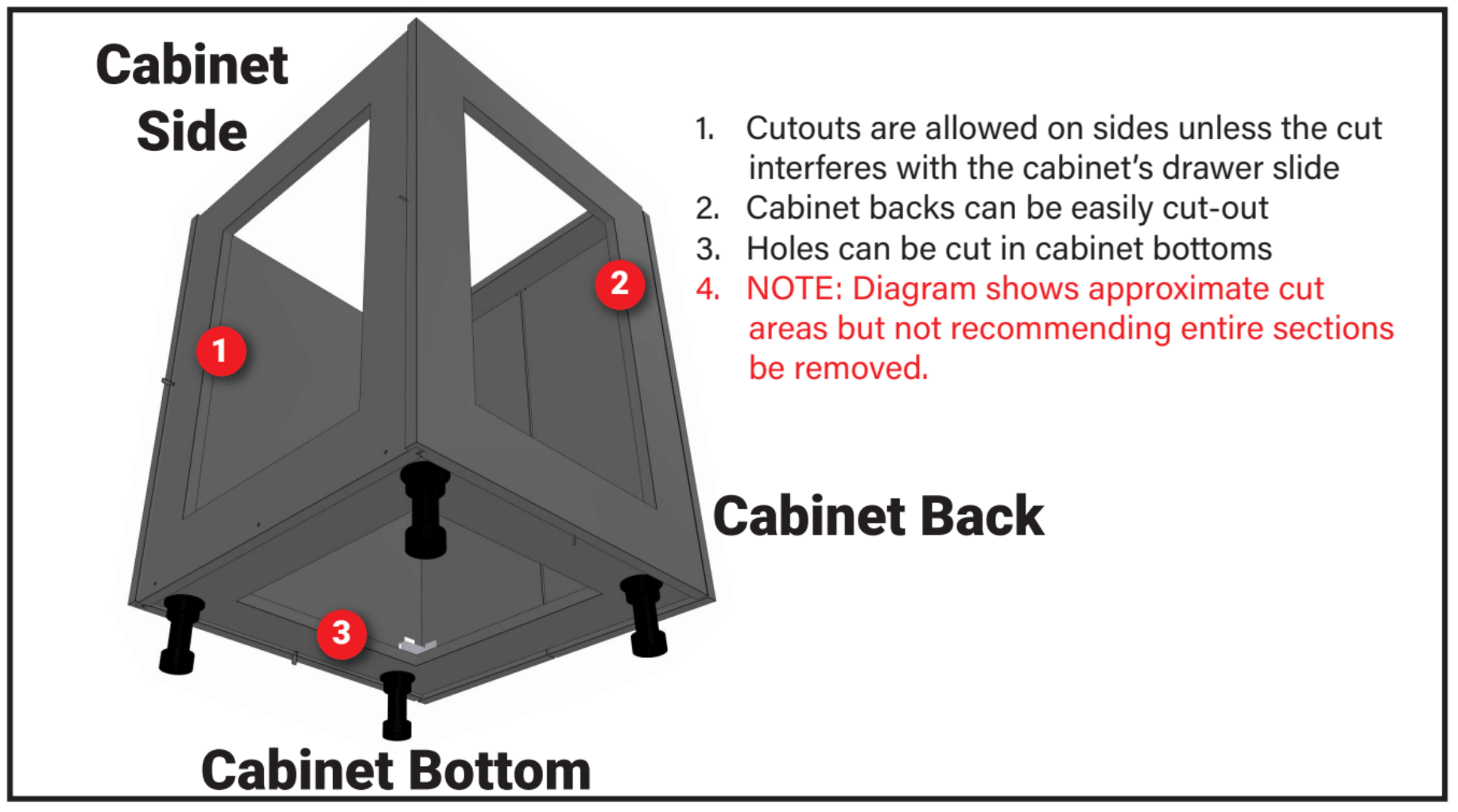 - Cabinet corners and joints should not be cut, as that will alter the structural integrity and strength of the cabinet.