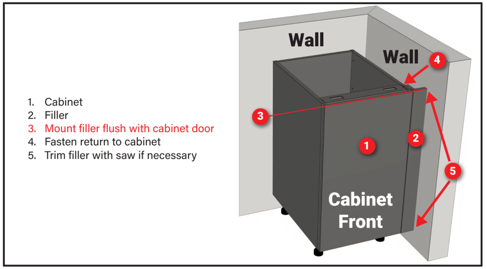 - Mount the Filler so that the face is flush with the adjacent cabinet’s door face.