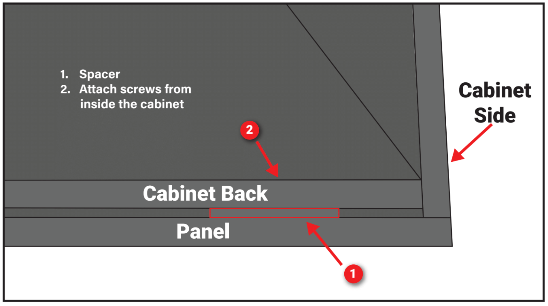 - Long Screws – 1 1/2″ Pan head screws – For holding panels in place. These fasten from the INSIDE of the cabinet. Do not screw into the face of the back panel. It is very important that you use the supplied screws that are the proper depth for securing the panel.