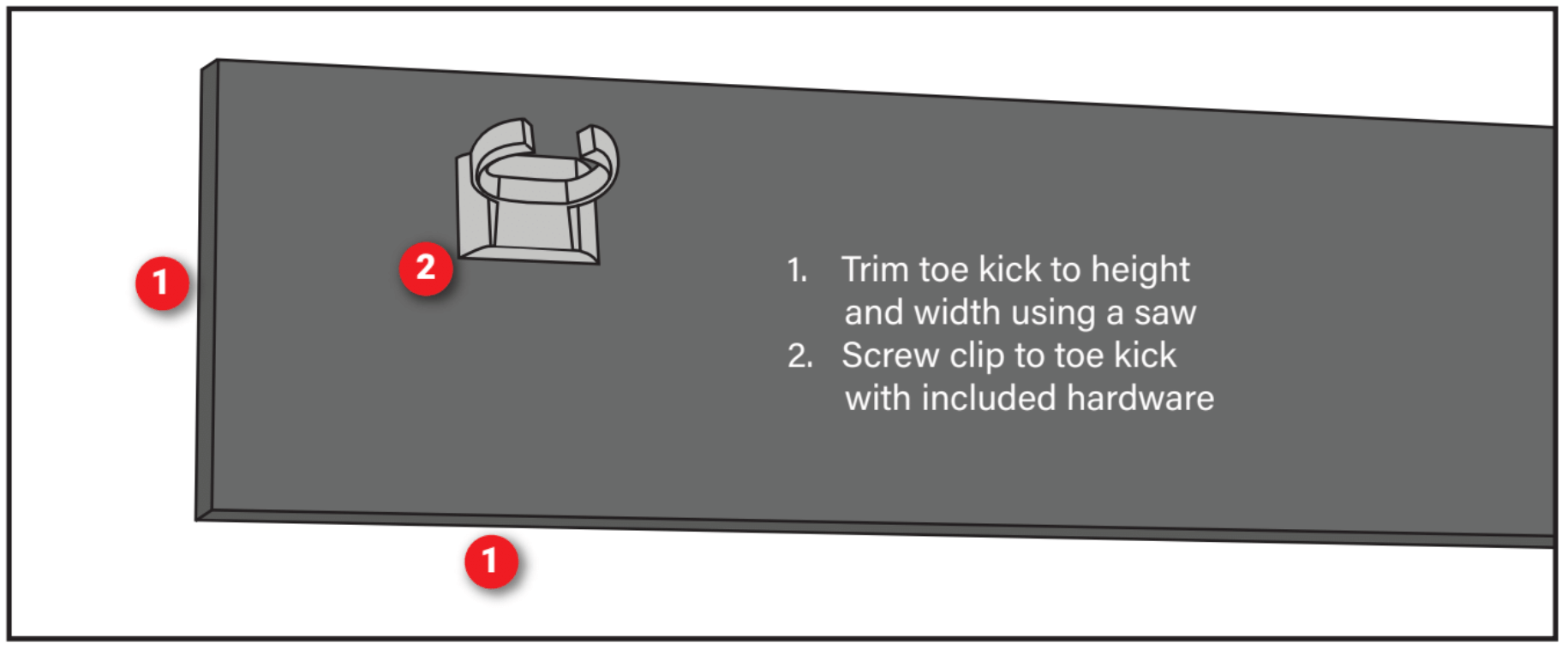 Once your cabinets are installed the toe kick can be added. Attach the clips to the toe kick with the included hardware. Toe kick can be trimmed to fit with a regular wood saw. Adjust the bottom of the kick to the grade of the ground for a finished look.